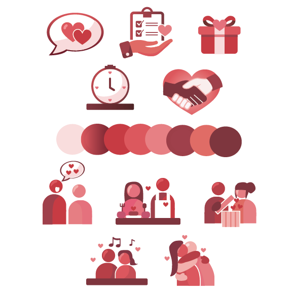 Using warm colors of pinks and reds helps show the emotions of love and endearment. Using a soft pink as the background helps emphasize the icons and designs around it. The partially transparent shapes around the edges of the page help the eyes focus in the center. The icons are in various shades of red to help push the different characters I wanted the audience to see performing the actions of love. The placements of the primary icons around the heart were done on purpose to help push them into design. The secondary icons are lined up at the bottom to provide examples of the different love languages.