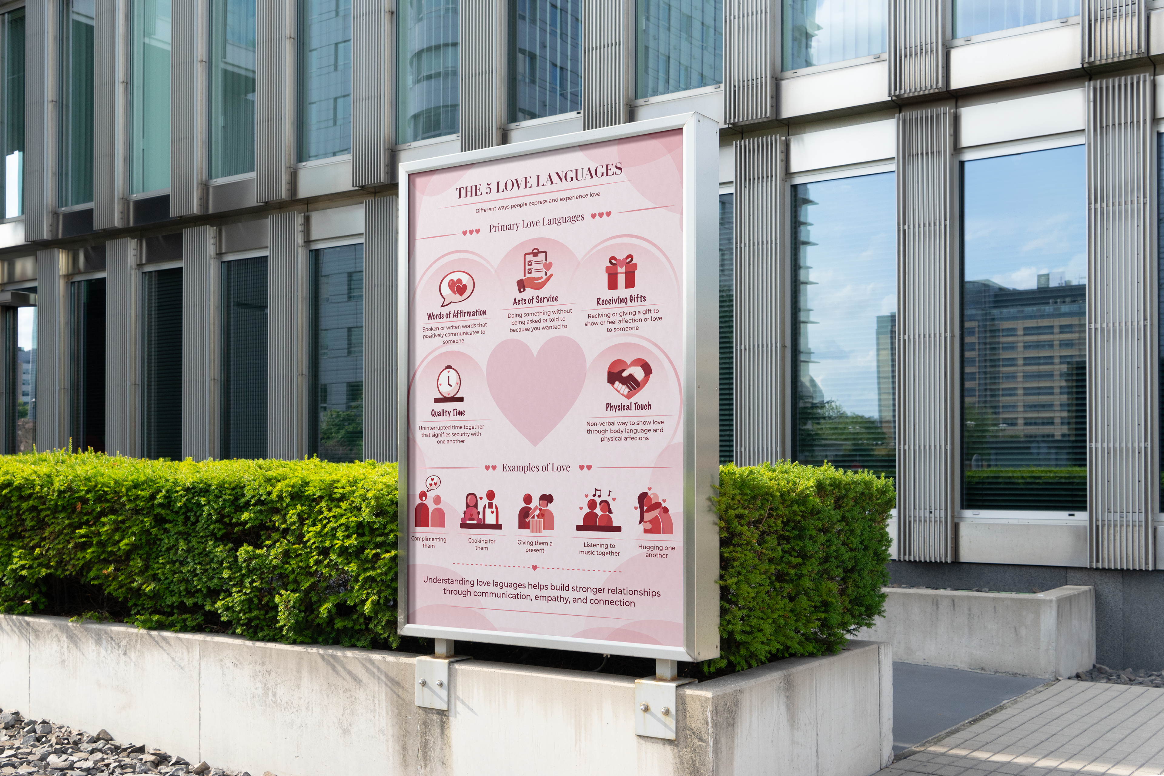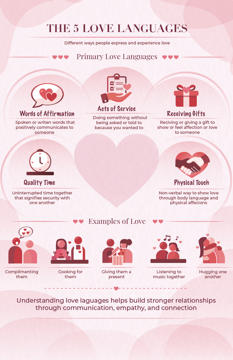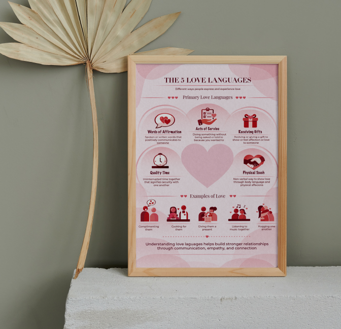 The infographic poster shows the 5 love languages and provides examples. It gives a visual of the 5 love languages in a clean, modern, and emotionally engaging style for a young audience, using simple shapes, warm colors, and clear typography to communicate how people express and experience love; understanding the differences between each love language is essential because it creates a distinct, recognizable visuals that prevent confusion, strengthen communication, and build emotional connection, ensuring each icon clearly represents a unique concept while still working together as a unified system, ultimately making the design both visually effective and meaningful rather than just decorative.