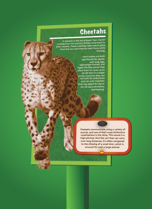 The primary goal was to modernize the zoo’s branding while maintaining an approachable and educational tone suitable for all age groups. Each icon is designed with clean, minimal line work and bold shapes, ensuring clarity while still capturing the unique characteristics of each animal. The redesigned wayfinding signs emphasize functionality and accessibility. Clear directional arrows, high-contrast color choices, and legible typography work together to guide visitors efficiently through the space. Creating a pop-out animal sign provides a visual appeal, with more information about the animal around the sign.