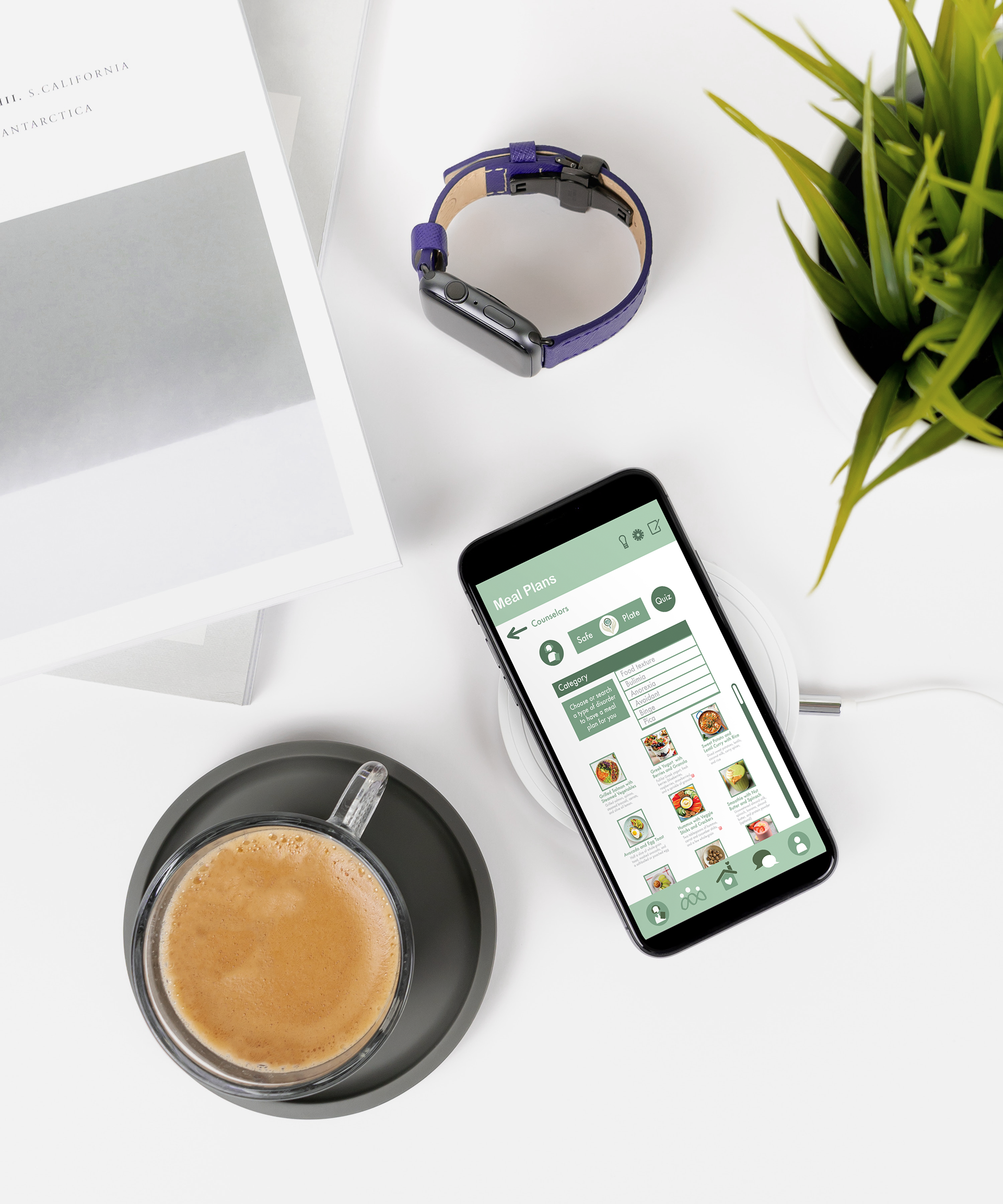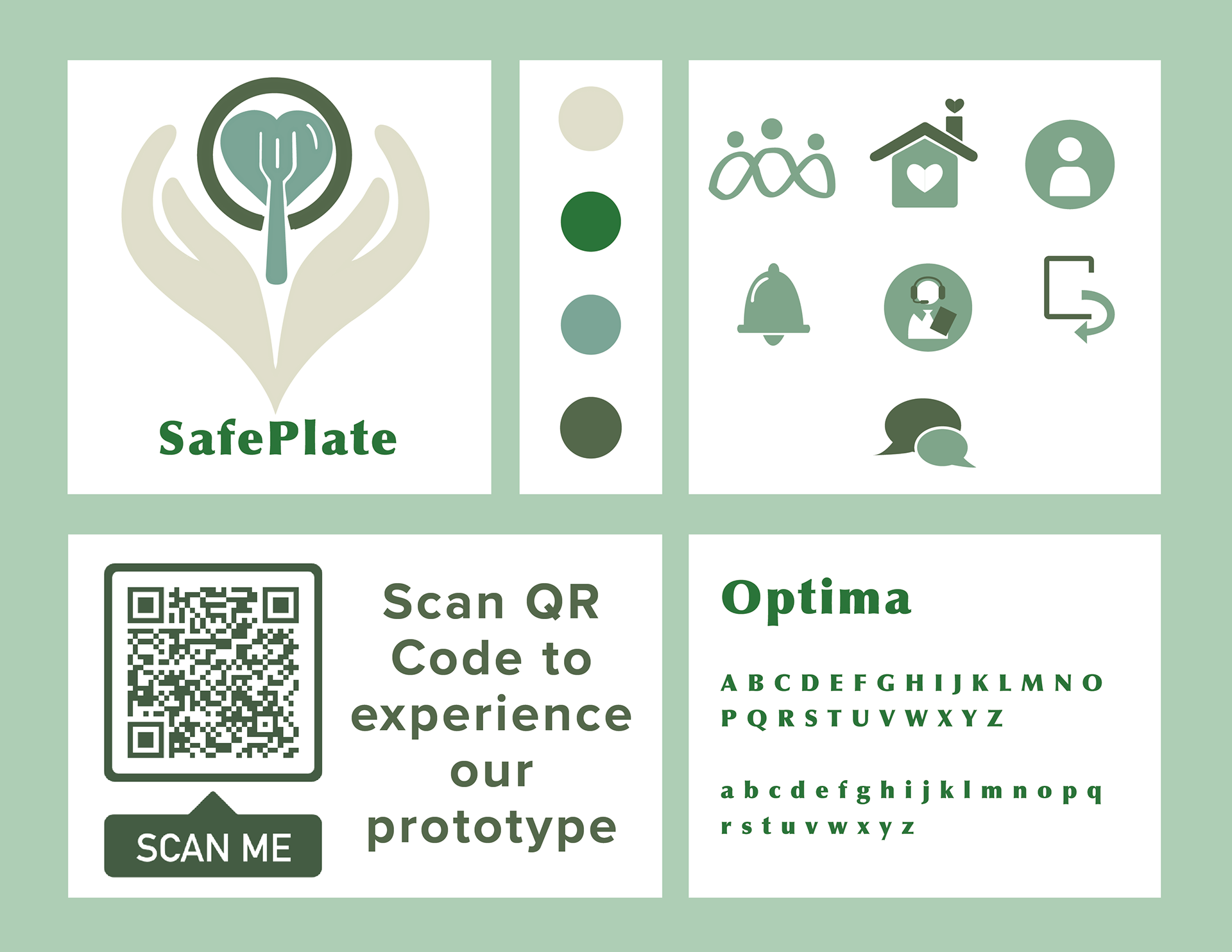 For the color palette consists of greens to signify health. The logo shows a pair of hands holding onto a fork with a plate, all while forming a heart. The fork implies a heart under it to signify the reassurance of food, telling the viewers it's okay to eat. With the warm tone colors, we want all viewers to feel comforted and relaxed.