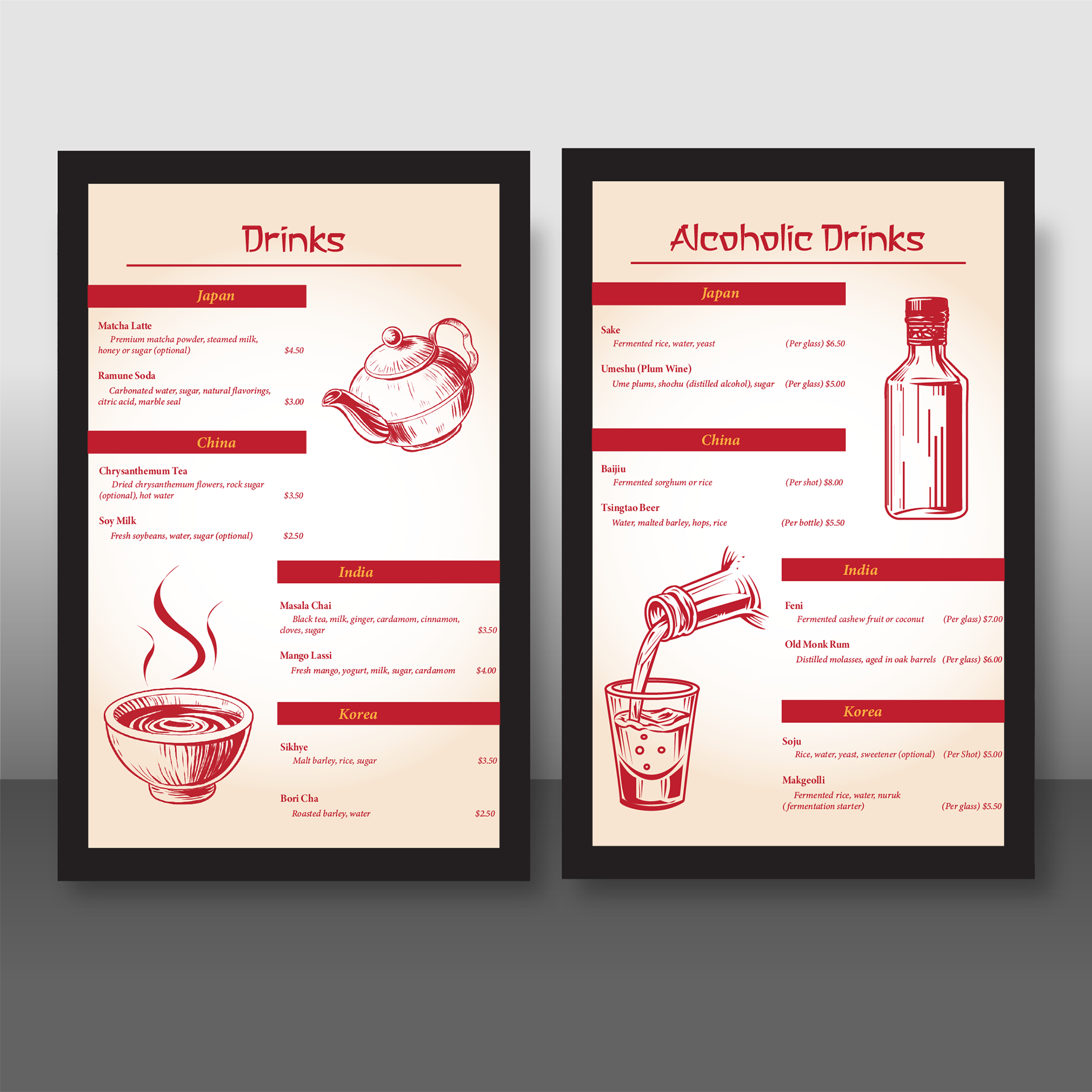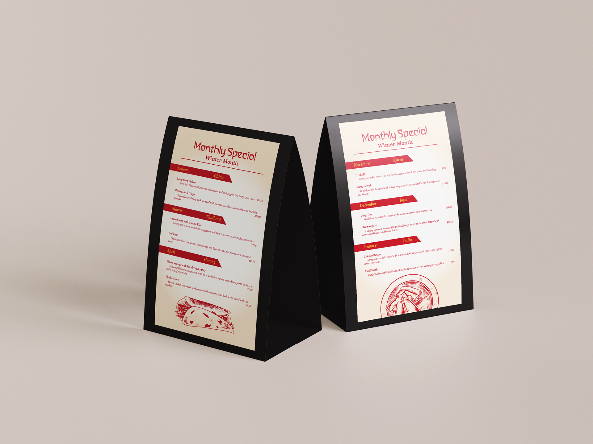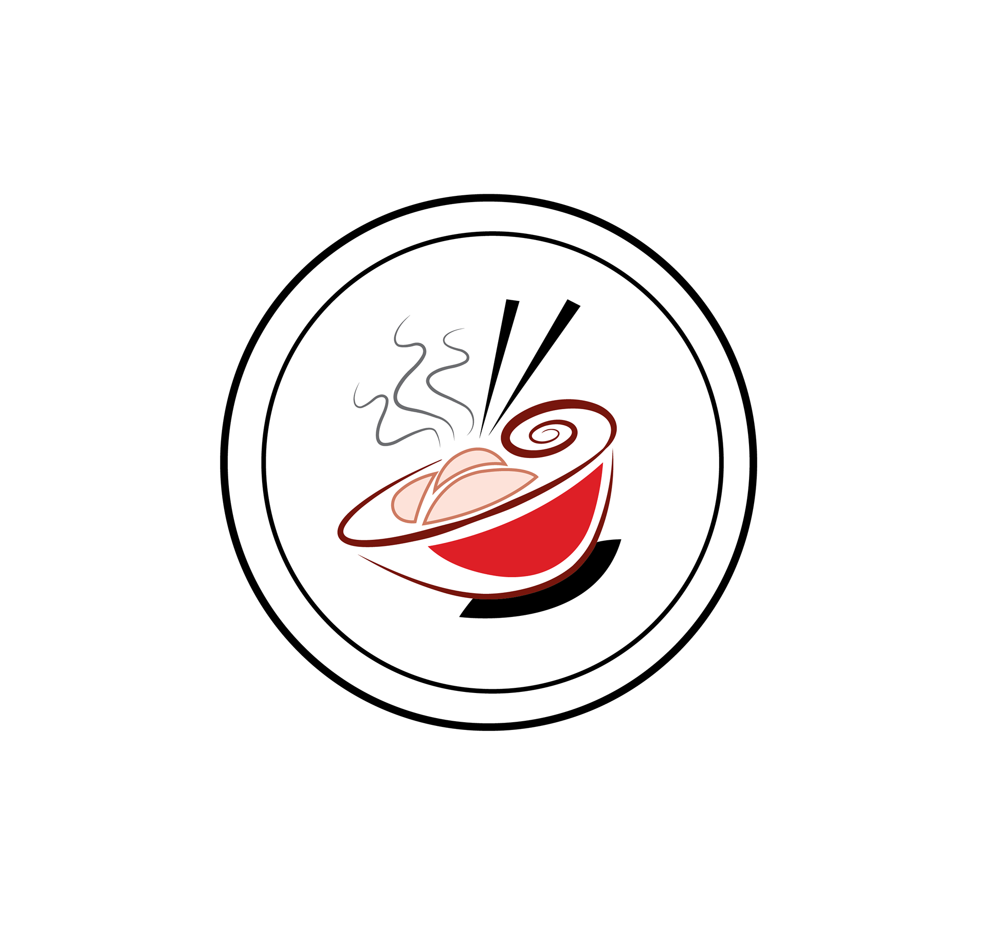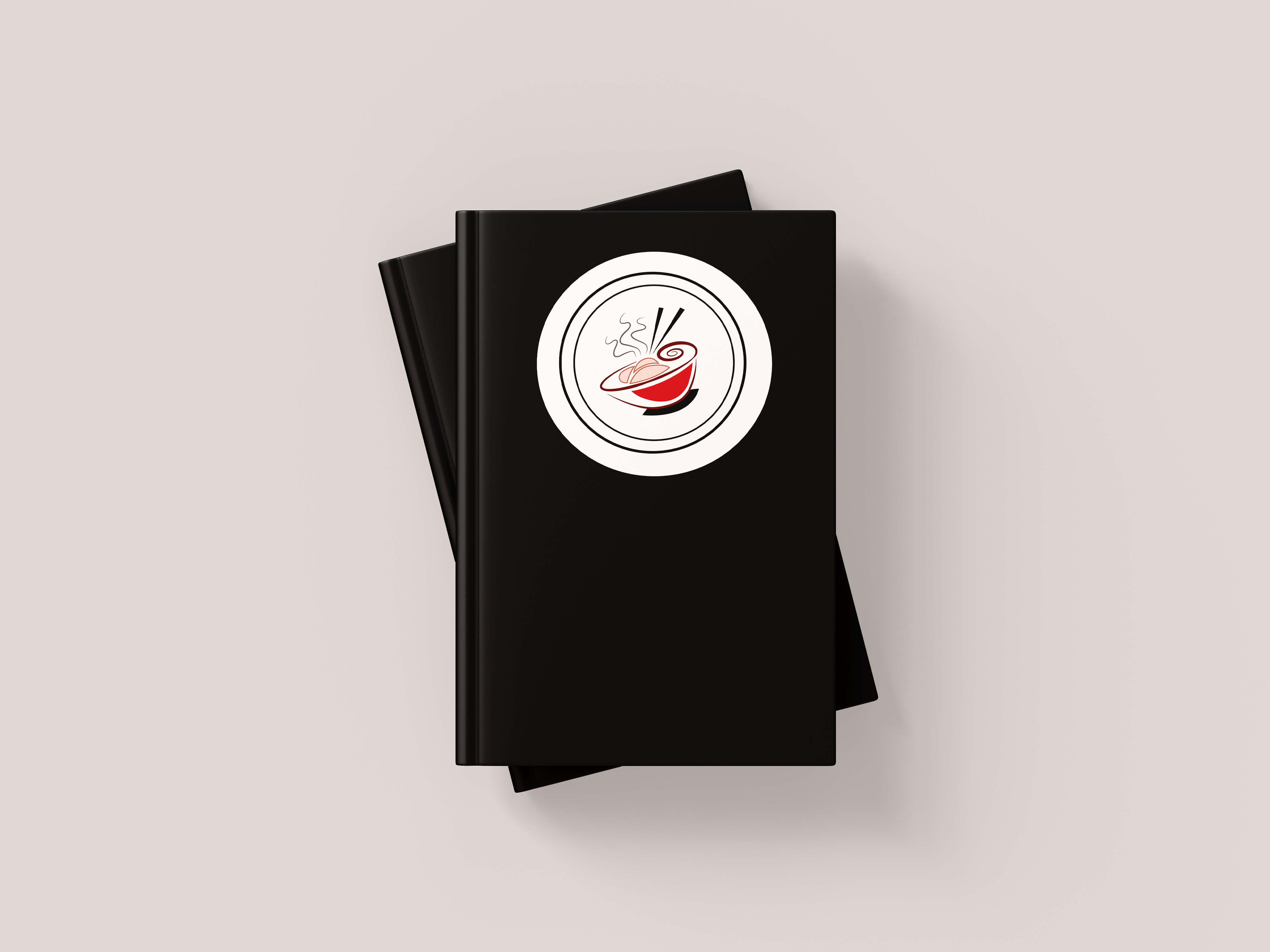 The logo design features an elegant, minimalist illustration of a steaming noodle bowl with stylized chopsticks, a sense of warmth and authenticity. The choice of red and black creates strong contrast and visual hierarchy, while the golden-yellow typography in a custom decorative typeface adds personality and sophistication, reinforcing the brand’s tagline of quality and cultural fusion. The restaurant’s sign mockup displays the logo within a circular frame for versatility and visibility in urban storefront settings, while the black menu cover mockup creates a high-end look that elevates the dining experience. The table tent and printed menu designs incorporate warm, muted backgrounds and red accent colors, guiding the reader’s eye through clearly organized dish sections by country. Subtle graphic illustrations at the bottom of the menu enhance the thematic dining concept without overwhelming the layout. Overall, the mockups demonstrate consistency in typography, color palette, and iconography, creating a unified brand experience that celebrates the diversity and elegance of Asian cuisine.